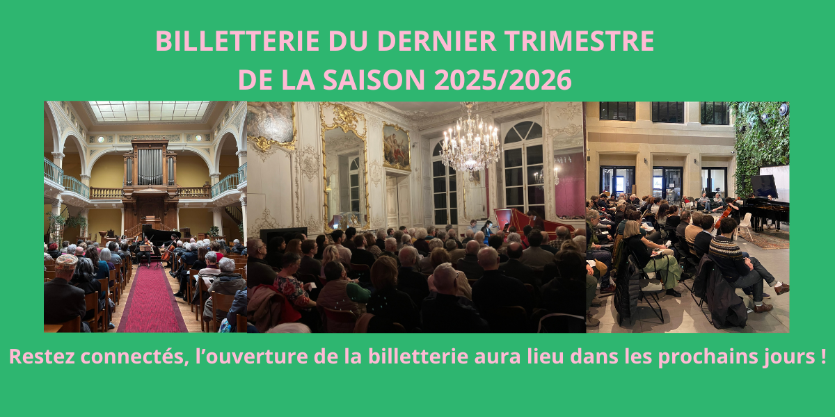 samedi 14 mars à 20h00Archives nationalesSoirée romantiquemardi 17 mars à 20h00Village by CA ParisÉchos de l’intime, Chopin et Brahmssamedi 28 mars à 20h00Archives nationalesTimbres Croisés : Violon et Accordéon classiquemardi 31 mars à 20h00Village by CA ParisSturmNos Actualités